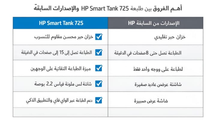 ما هي أهم الفروق بين طابعة hp Smart Tank 725 والإصدارات السابقة؟