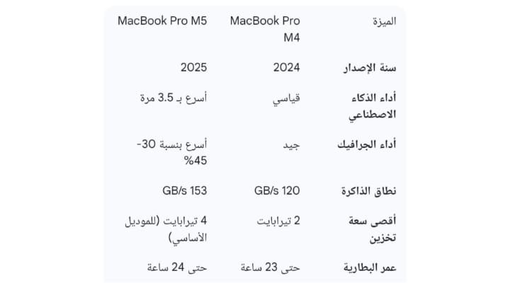 - الأداء: M5 يتفوق في معالجة الذكاء الاصطناعي والتعلم الآلي بفضل المعماريّة الجديدة.