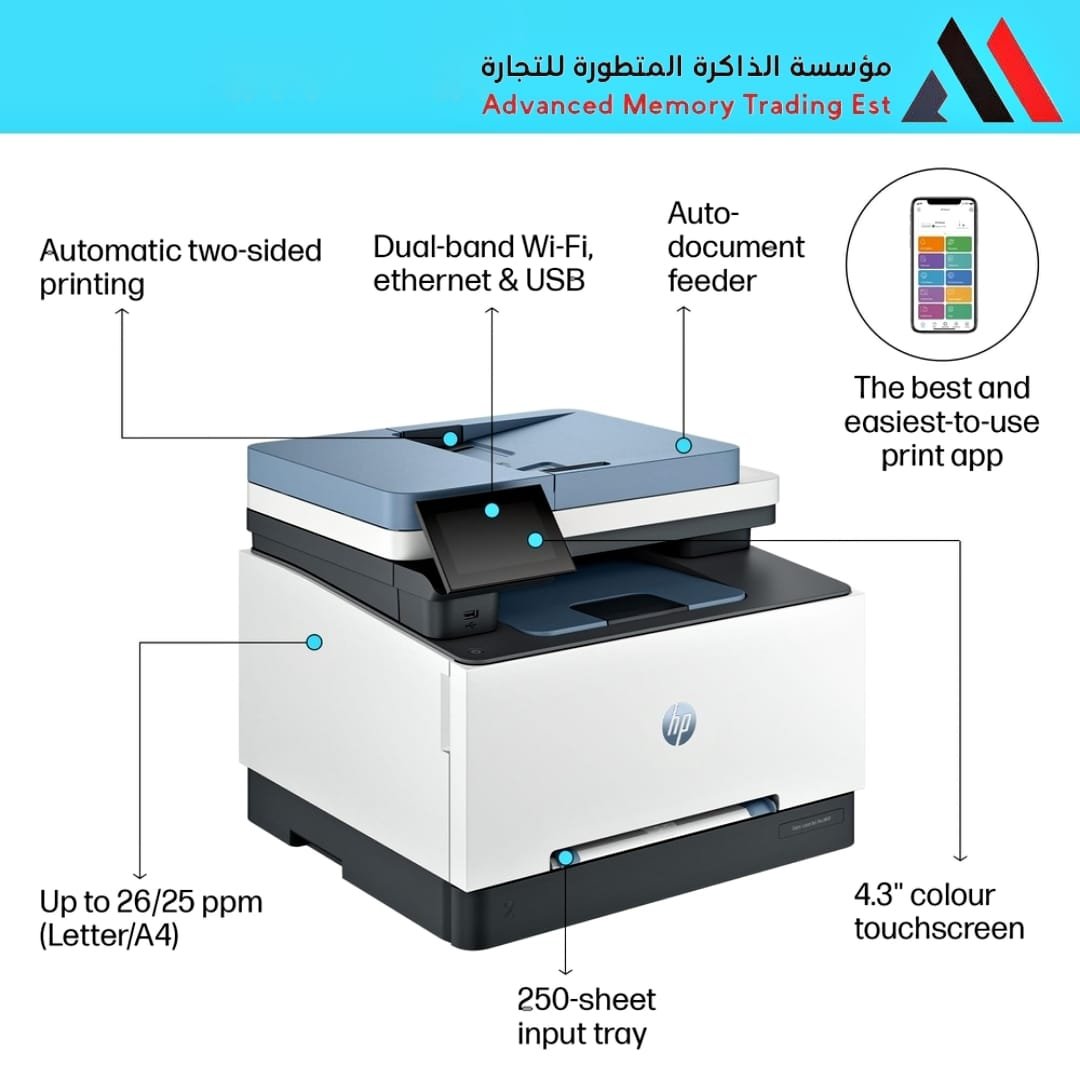 - الاتصال: تدعم واي فاي (Wi-Fi) مزدوج النطاق، إيثرنت (Ethernet)، والطباعة من الهاتف عبر تطبيق HP Smart.