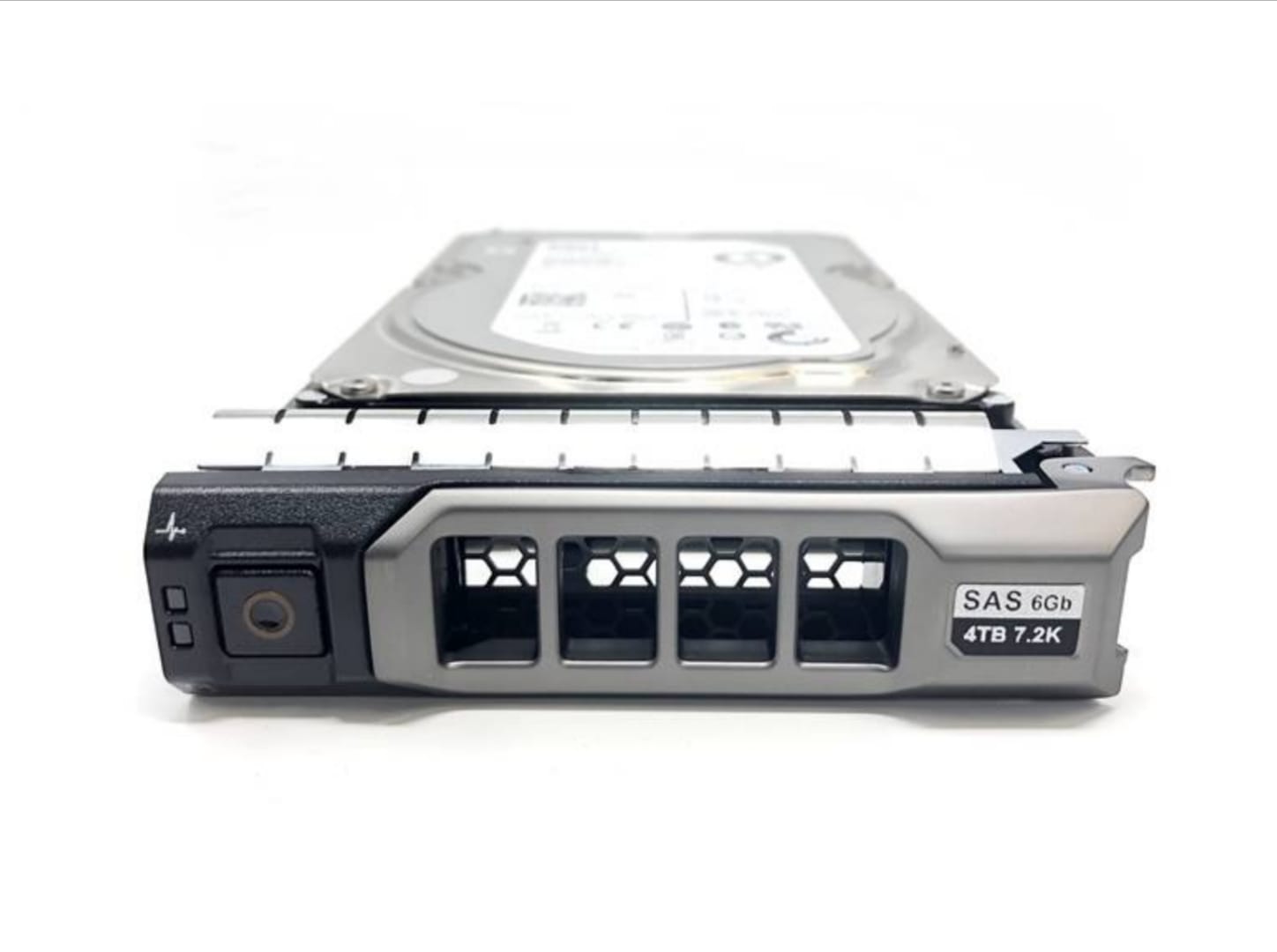 - الحامل الخاص (Caddy/Tray): يأتي القرص مثبتًا داخل “درج” أو حامل معدني وبلاستيكي مزود بمقبض ومصابيح LED (مؤشرات حالة). هذه المصابيح تعطي إشارات ضوئية تخبر الفني بحالة القرص (أخضر للعمل الطبيعي، برتقالي للتنبيه أو الفشل).